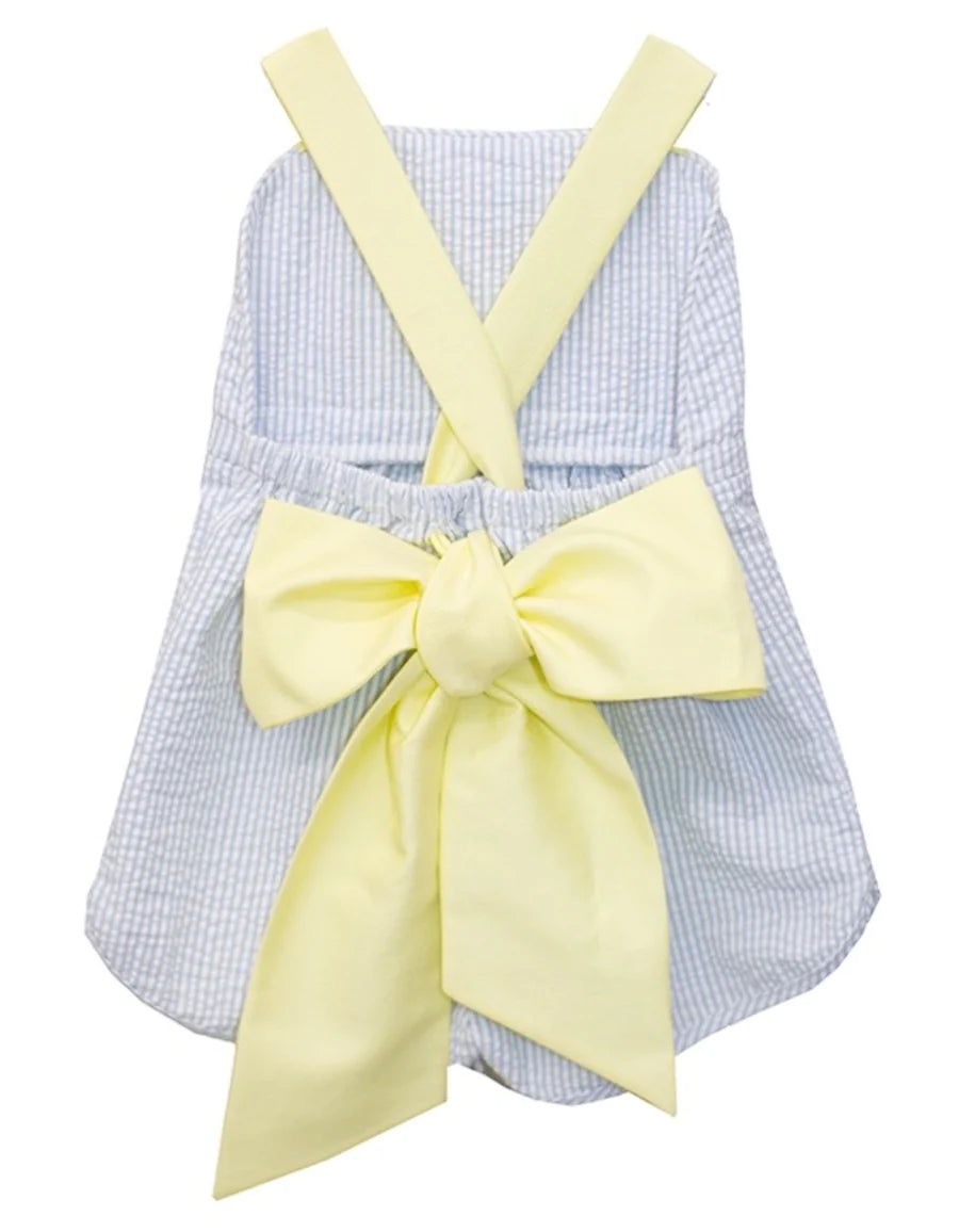 Shine bright in this sweet sunshine overall with a precious yellow bow on the back