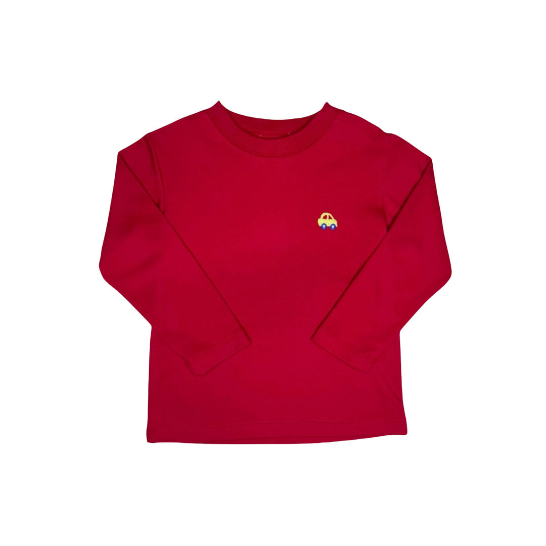 A bright red knit tee with cheerful car embroidery, breathable and comfy for all-day play.