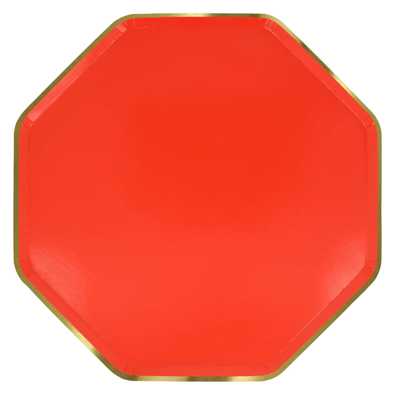 Food served on the side has never looked so stylish! These berry red paper plates, with an octagonal shape and shiny gold foil border, will add pizzazz to any party. The color is on both the front and back for an elegant effect.