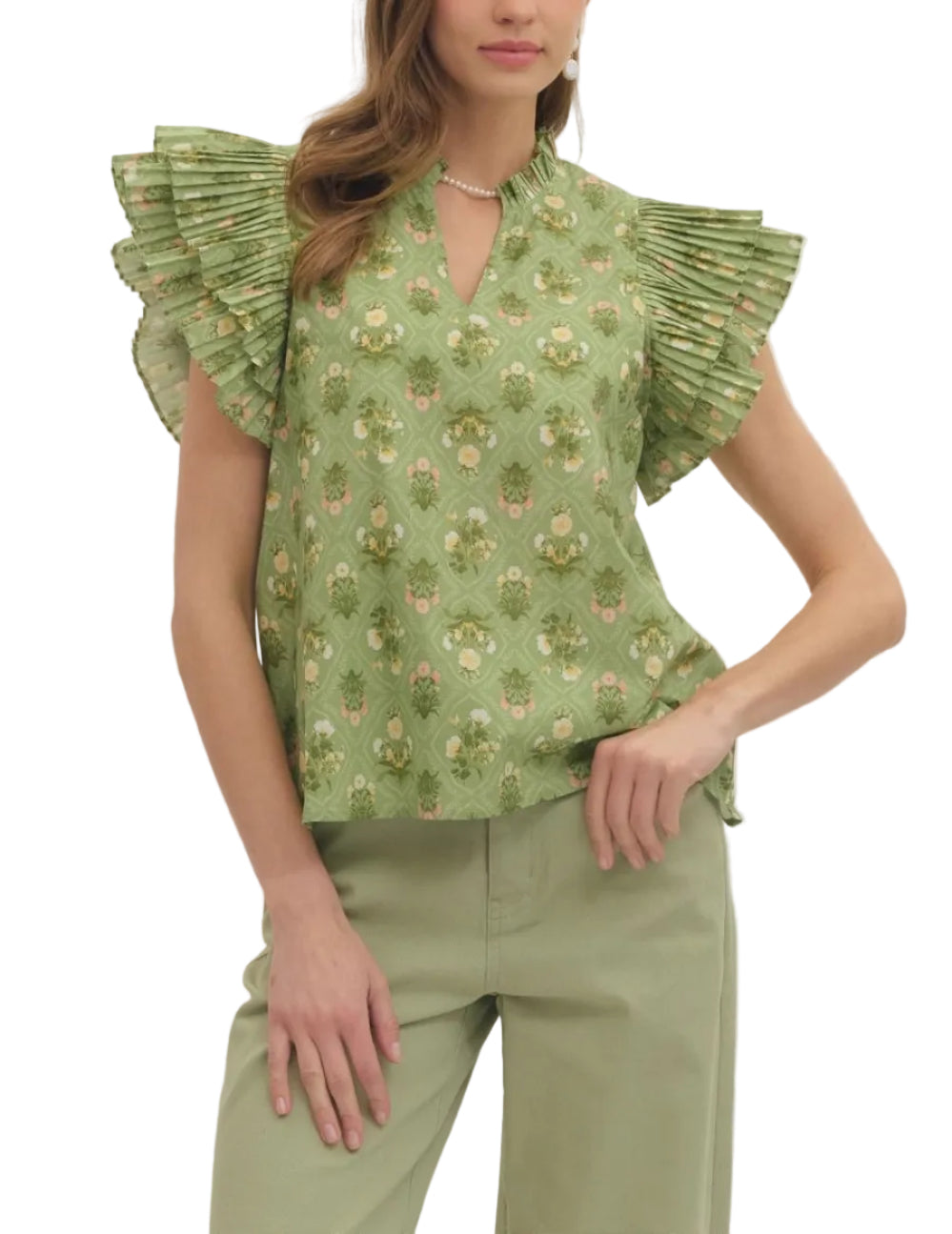 Ella Pleated Sleeve Top with Botanical Print – Flutter Sleeve Blouse with Ruffle Collar. Lightweight woven fabric, non-sheer construction, unlined design. Perfect for casual and professional styling. Shop botanical print tops with elegant pleated details and V-neck ruffle band collar.