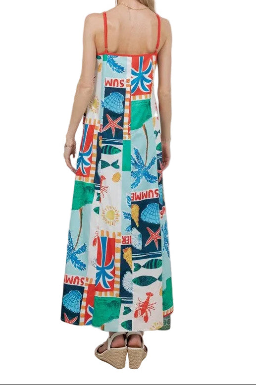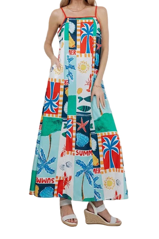 Embrace the spirit of summer with this vibrant and playful maxi dress. Featuring a colorful patchwork print of iconic beach motifs like palm trees, lobsters, seashells, and the word "SUMMER," this dress is designed to bring sunshine to your wardrobe. The spaghetti straps and square neckline offer a flattering silhouette, while the flowy, maxi length ensures comfort and effortless style. Perfect for a day at the beach, a casual outing, or a tropical vacation, this lightweight and breathable dress is a must-have for your warm-weather collection. Pair it with sandals or wedges for a complete, chic look that radiates fun and vacation vibes. Its relaxed fit makes it a versatile choice for various occasions.