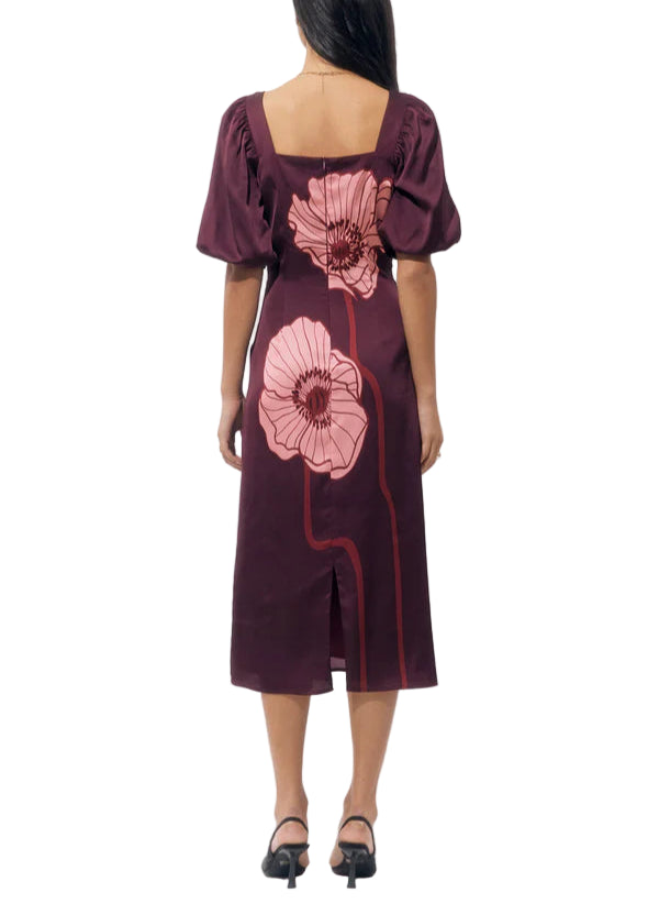 This dress is crafted from a lightweight, flowing fabric with a beautiful poppy floral print on a burgundy background. It features a fitted, ruched bodice that transitions into a cascading maxi dress. The long, sheer puff sleeves add a touch of romance and fashion to the design.