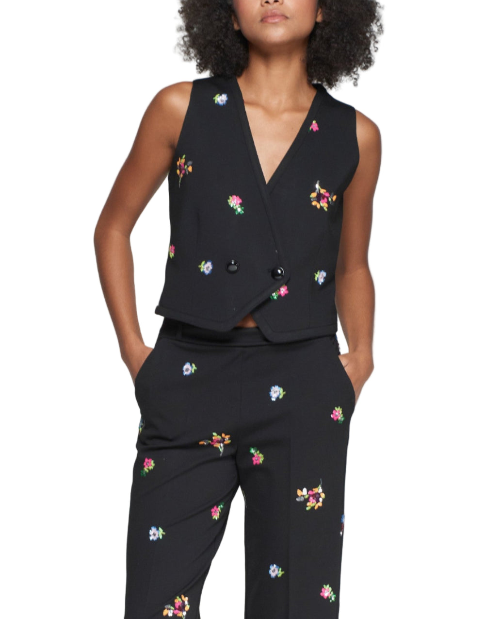 Black V-neck wrap waistcoat with front button fastening. Exclusive design with multicolour floral sequin embroidery. Straight cut with subtle waist shaping. Made from structured Roma knit fabric with a smooth finish. Matching blazer and trousers available from the same collection.