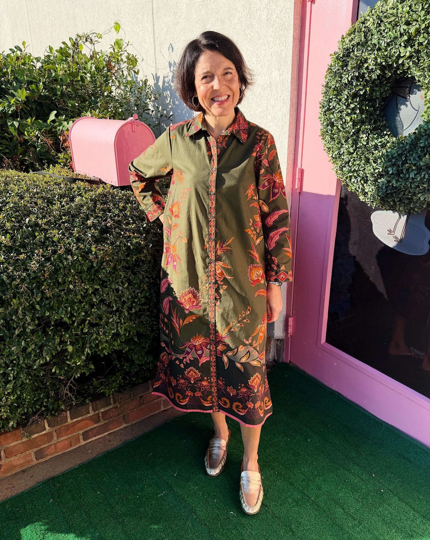 Step into effortless elegance with the Eliza Midi Dress in Olive Trails. This charming piece features a gorgeous earthy palette that pairs beautifully with everything in your wardrobe.