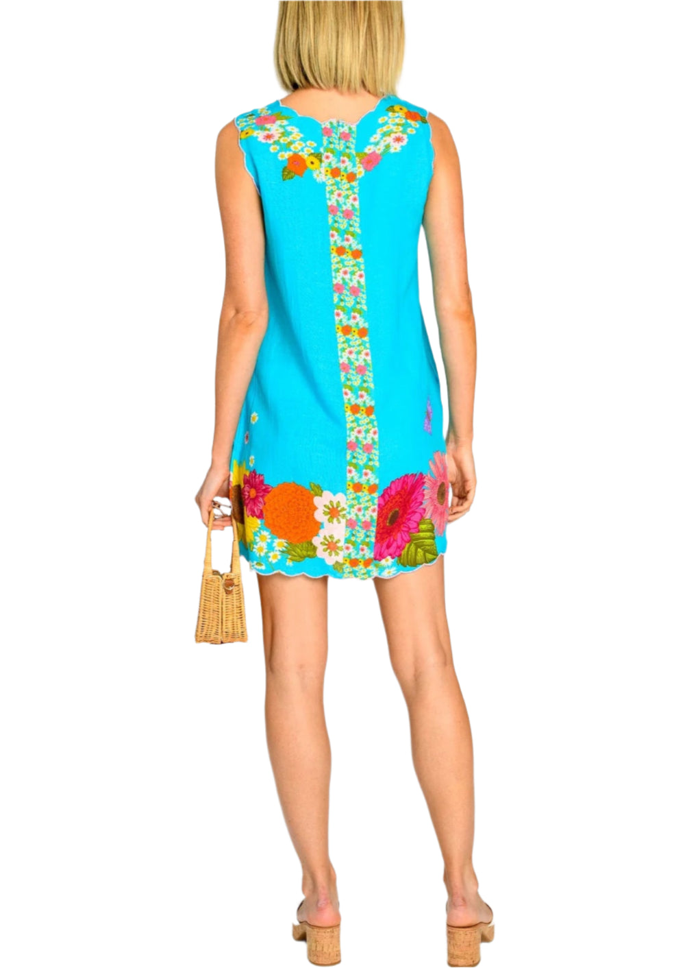 This easy to wear, classic shift style is a customer favorite! We've updated Ellie this season with a bright blue linen blend fabric and our Wildflower Aqua print, finished with pink scalloped edges.