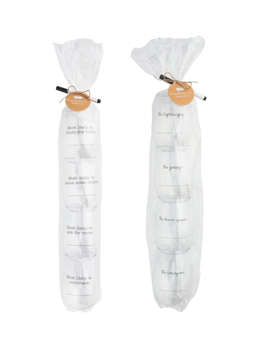 • Four plastic stemless wine cups with customizable sayings