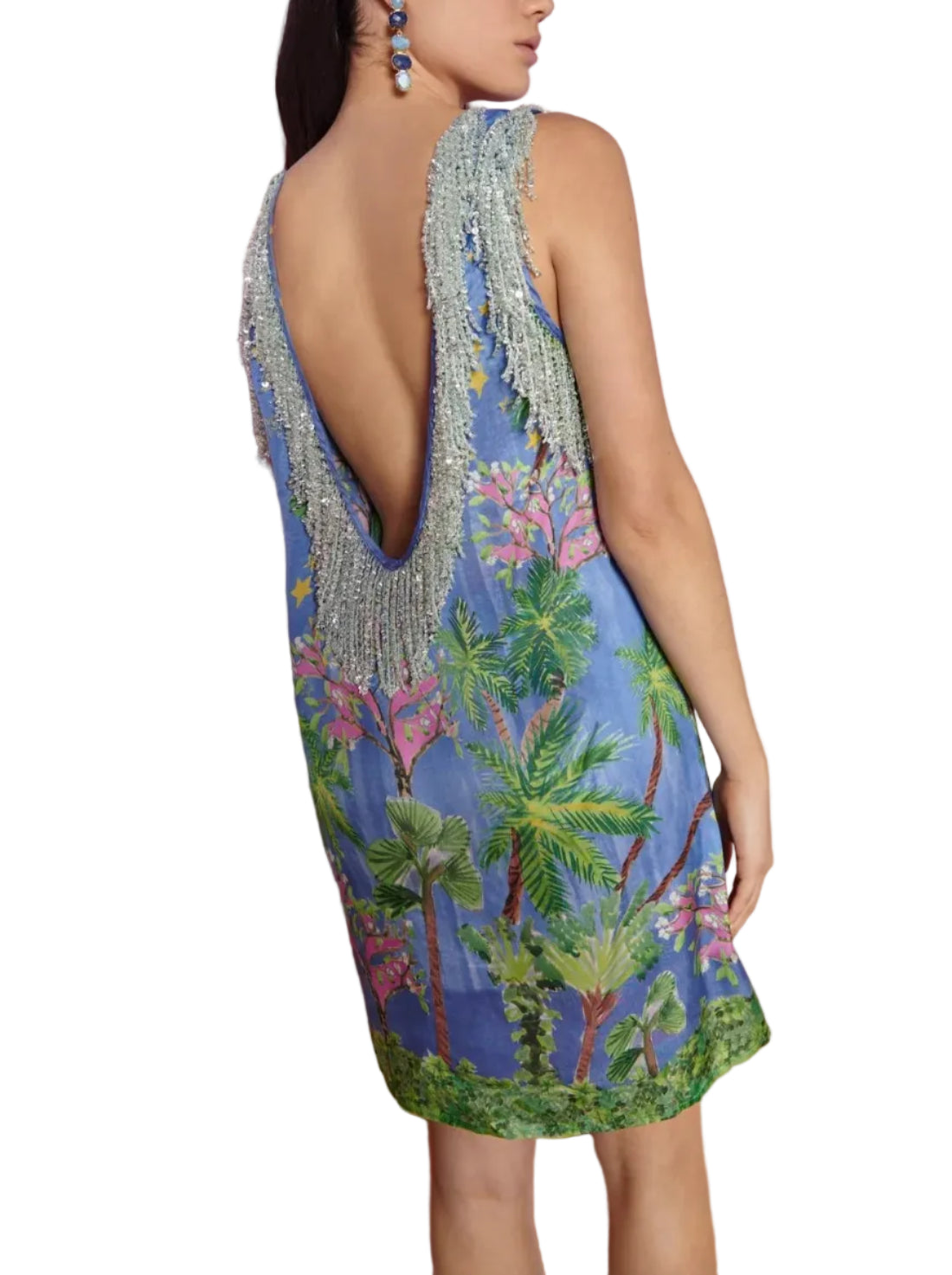 A show-stopping mini that brings the jungle to life. The Ursa Dress features an airy silhouette adorned with lush palm trees, starlit skies, and dreamy botanicals. The real magic? An open back framed by dazzling beaded fringe that sways with every step. Made for summer soirées, rooftop cocktails, or turning heads wherever you go.
